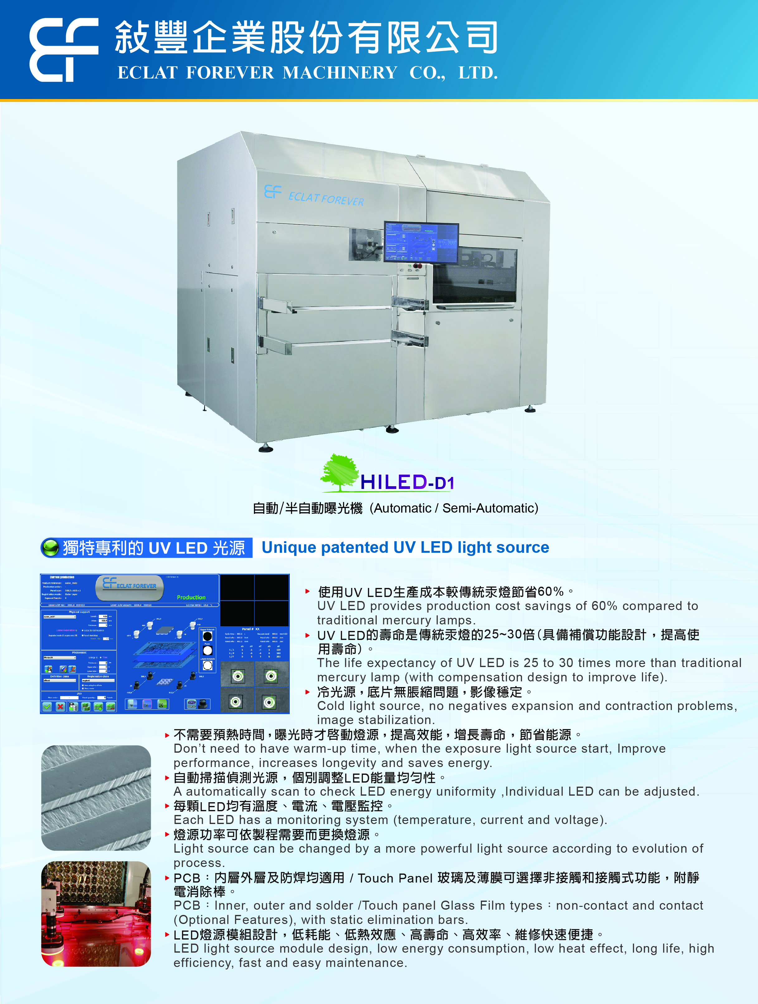 In response to global trends in energy conservation and environmental protection, and to help improve customer product yield, Eclat Forever Machinery made a significant investment and collaborated with European technology partners to develop UV LED exposure systems, replacing conventional high-energy-consumption mercury lamp exposure machines.