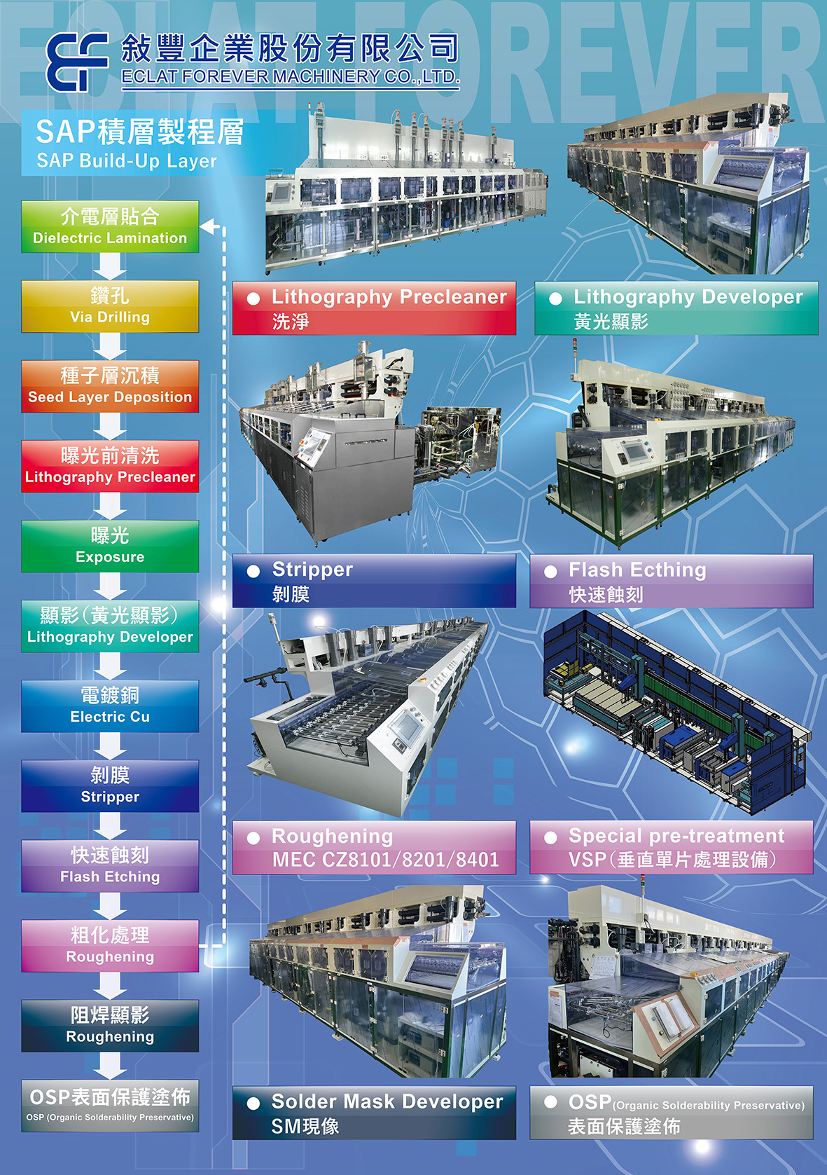 5G 通信および AI 高効率演算の普及に伴い、技術要件は年々高度化しています。当社は近年、mSAP・SAP をはじめとする高階載板、FC-BGA、ならびにウエハーレベルパッケージ(WLP)といった先進封装分野に向け、主要プロセスに対応した ウェットプロセス装置 の研究開発に積極的に取り組んでまいりました。あわせて、自動化およびインテリジェント監視機能の強化を進めています。